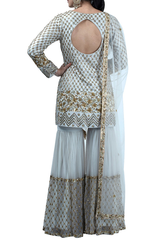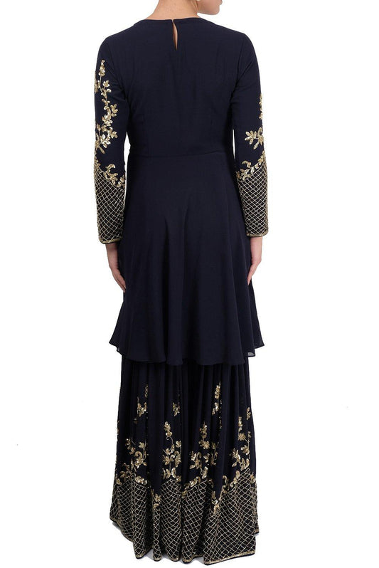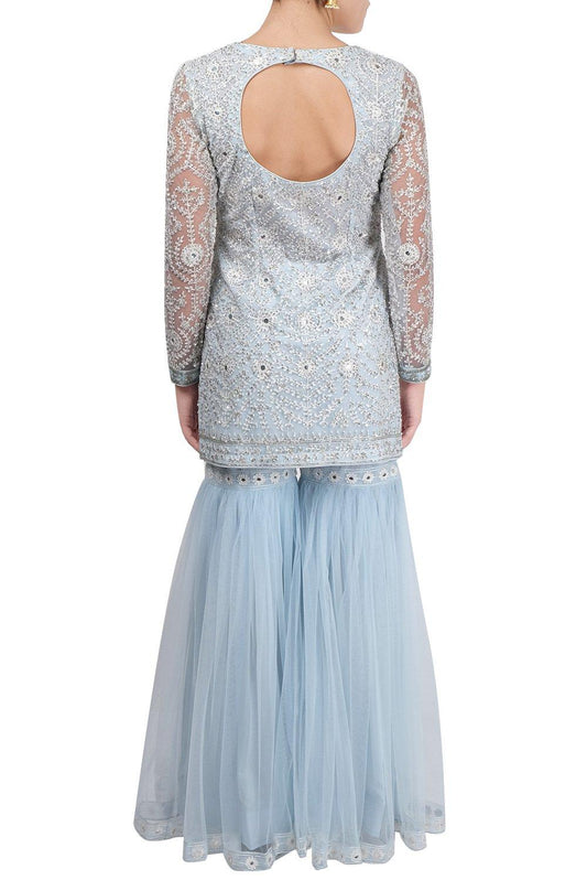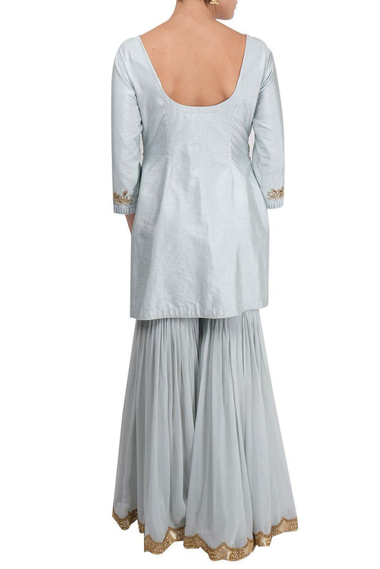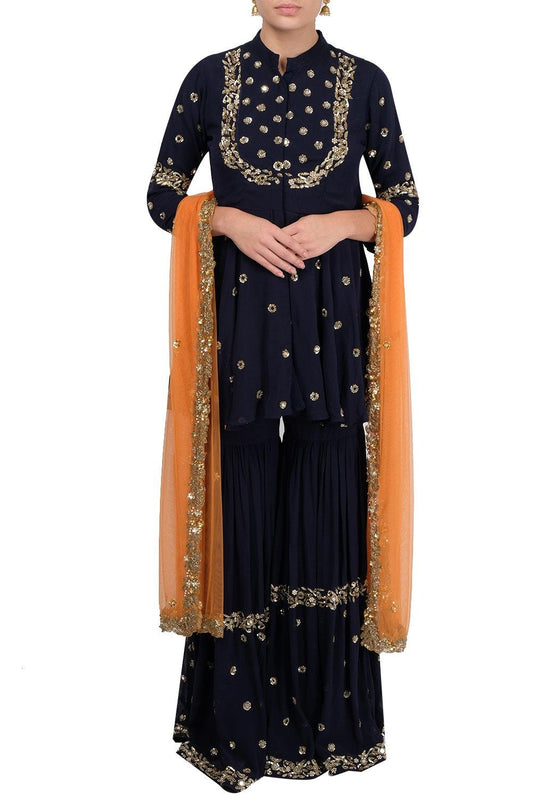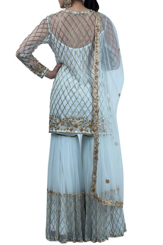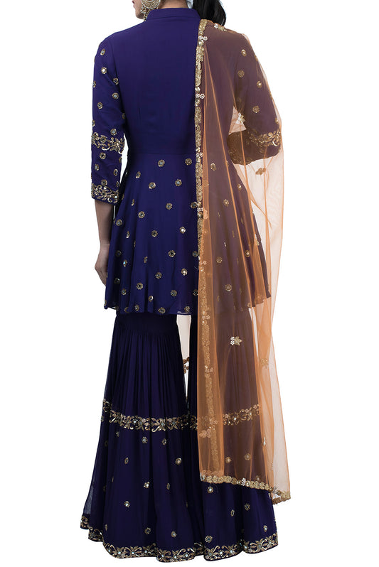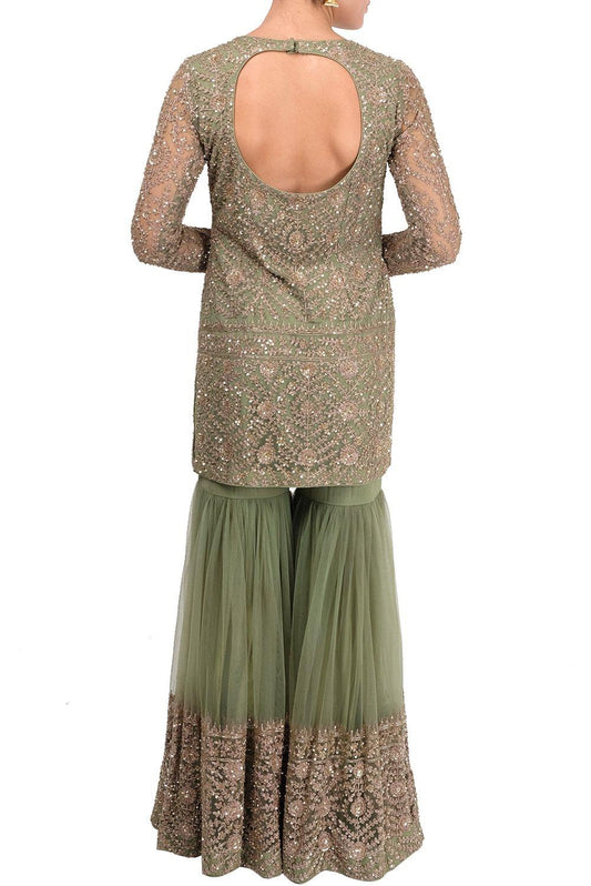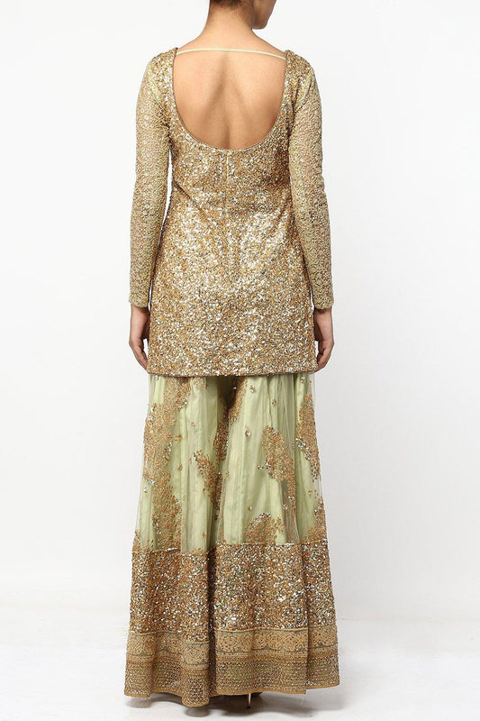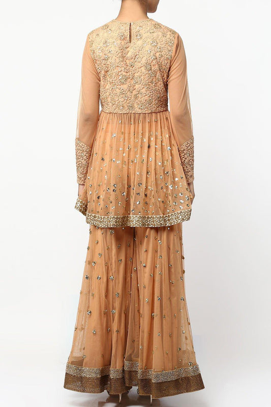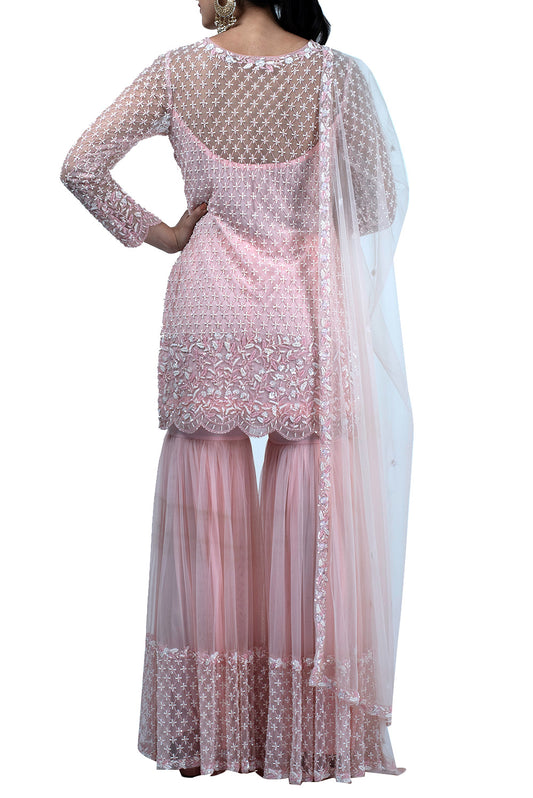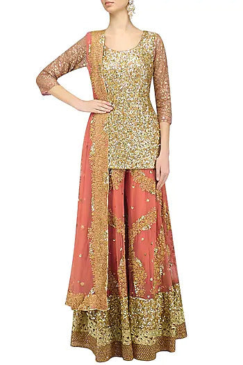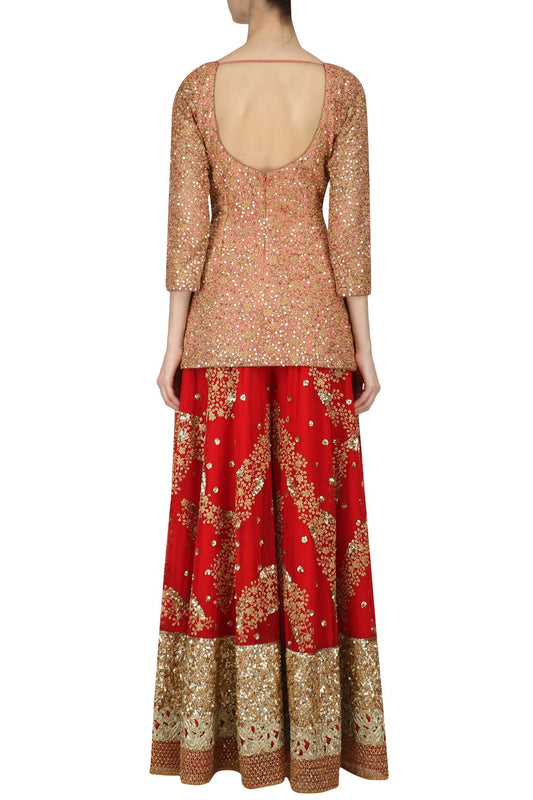 Salmon Pink Sequinned Kurta with Red Sharara Pants