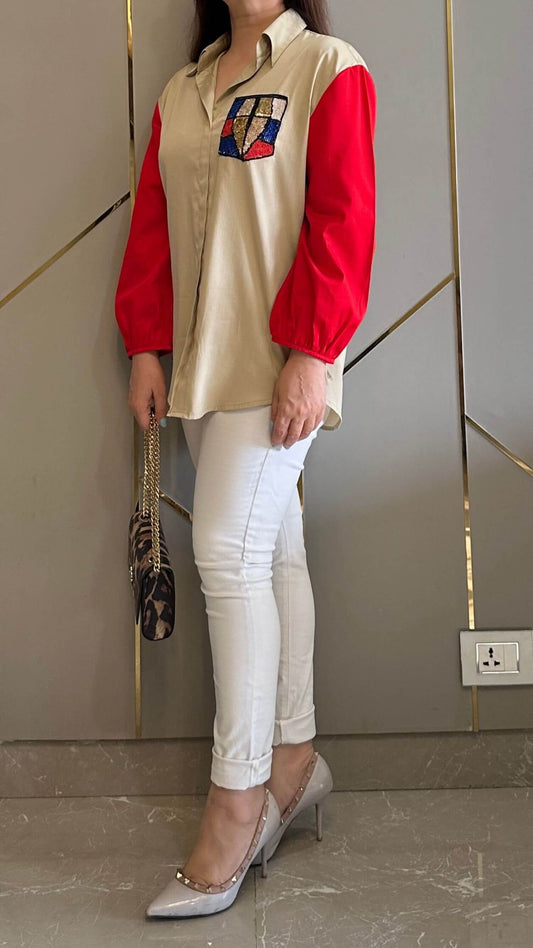 Happy Red Sleeves Hand Embroidered Shirt