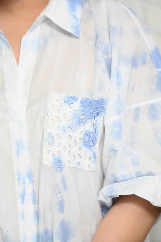 Blue-White Oversized Tie-Dye Cotton Shirt with Face Mask