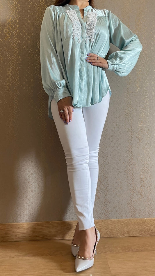 Powder Blue Hand Embroidered Luxe Satin Shirt