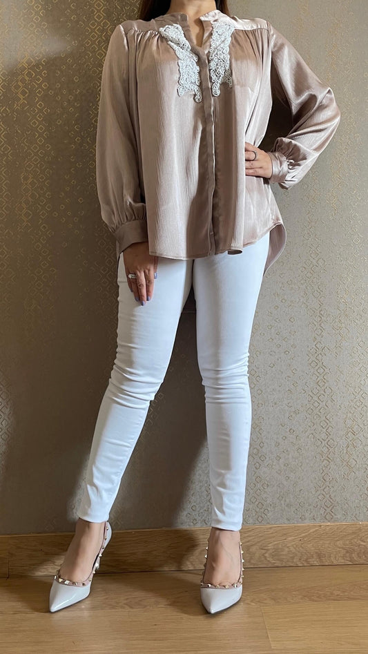Mocha Hand Embroidered Luxe Satin Shirt