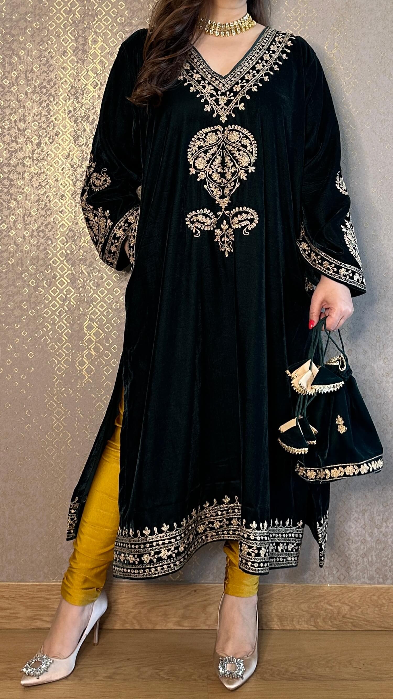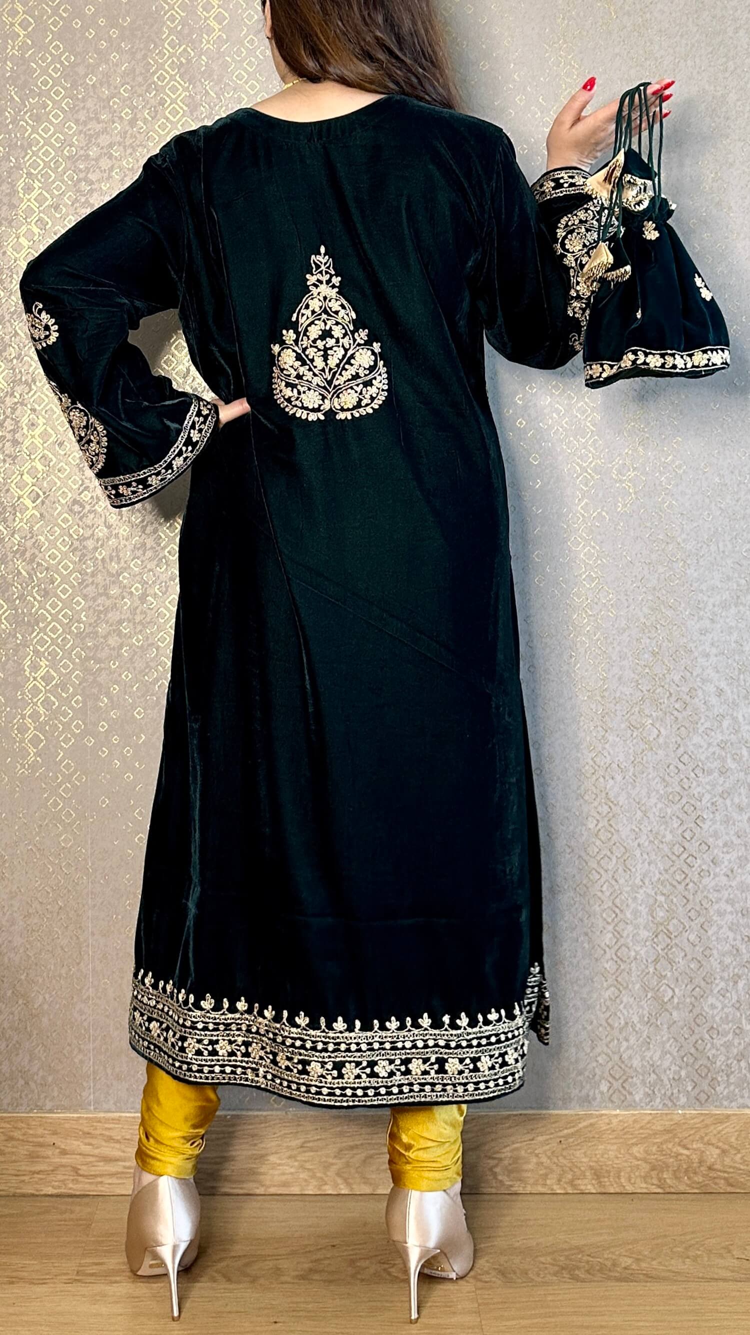 Deep Bottle Green Velvet Kashmiri-Phiran Kurta with Churidar and Matching Potli