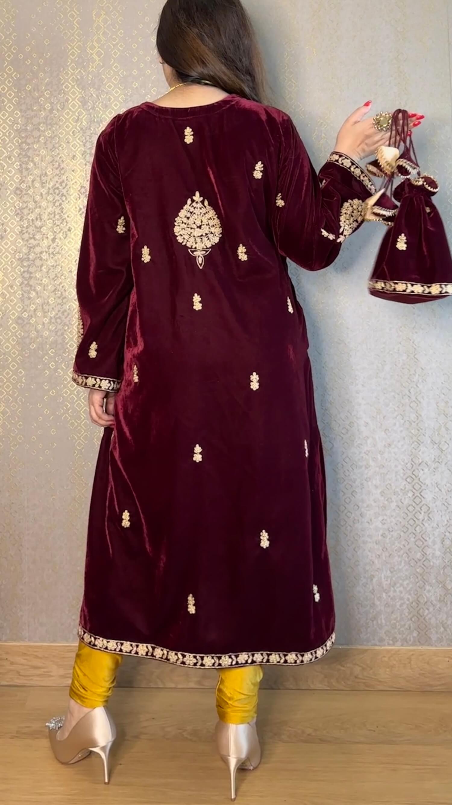 Maroon Paisley Velvet Kashmiri-Phiran Kurta with Churidar and Matching Potli