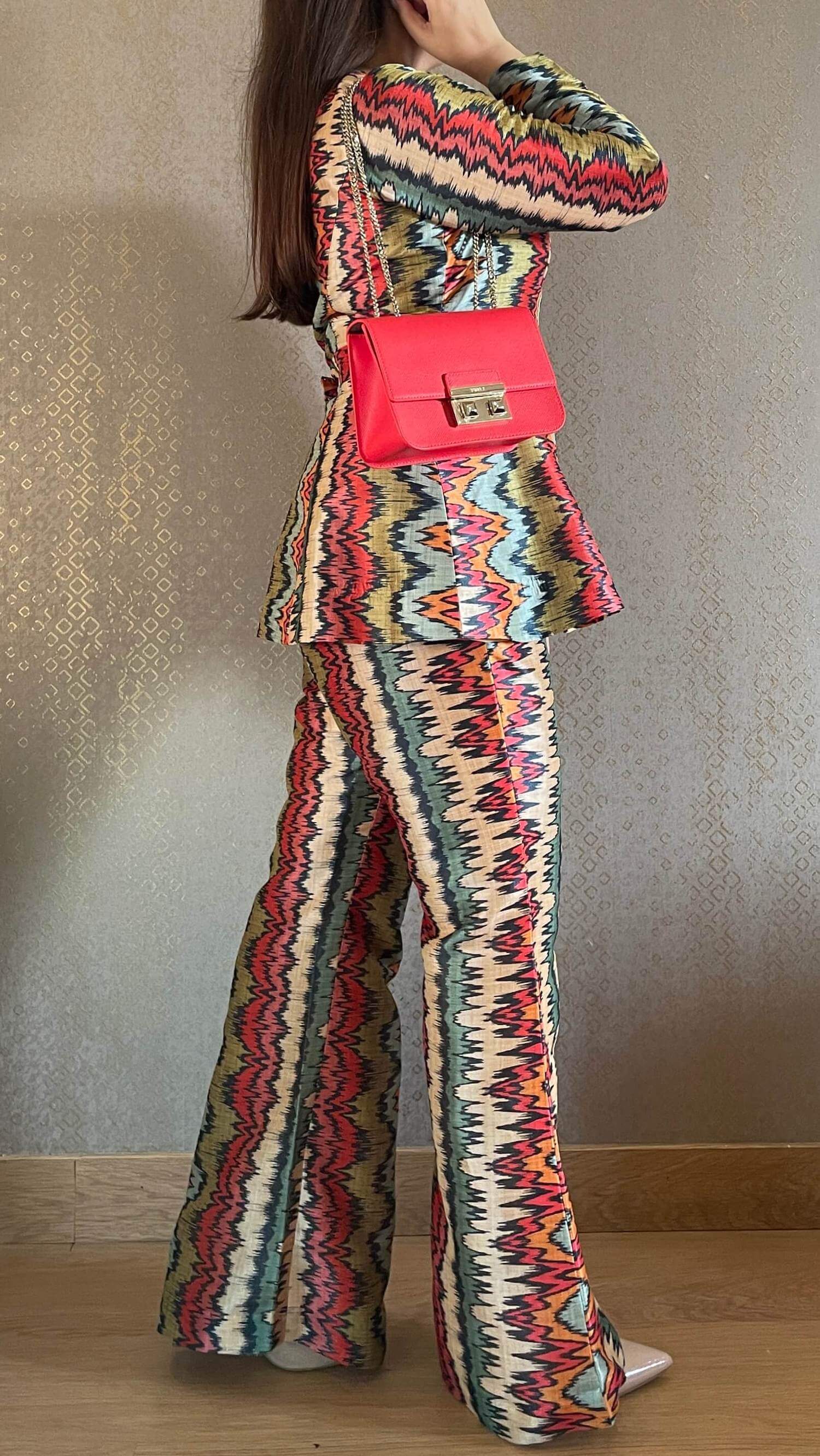 Structured sleeved top with matching flared pants and hand embroidered belt.